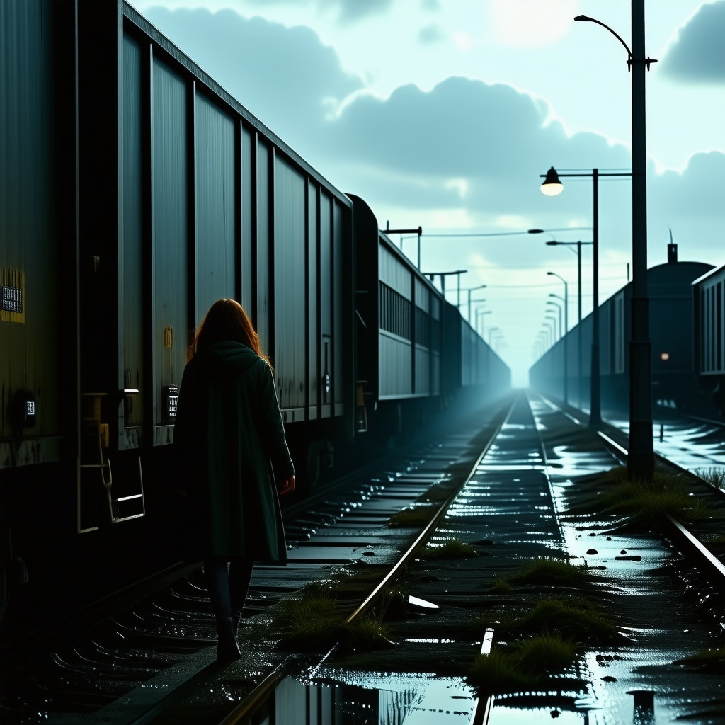 Her breath came in short gasps as she stepped over rusted tracks, the scent of oil and damp wood thick in the air. The train yard had been abandoned for years. It was a graveyard of -- steel and ghosts.